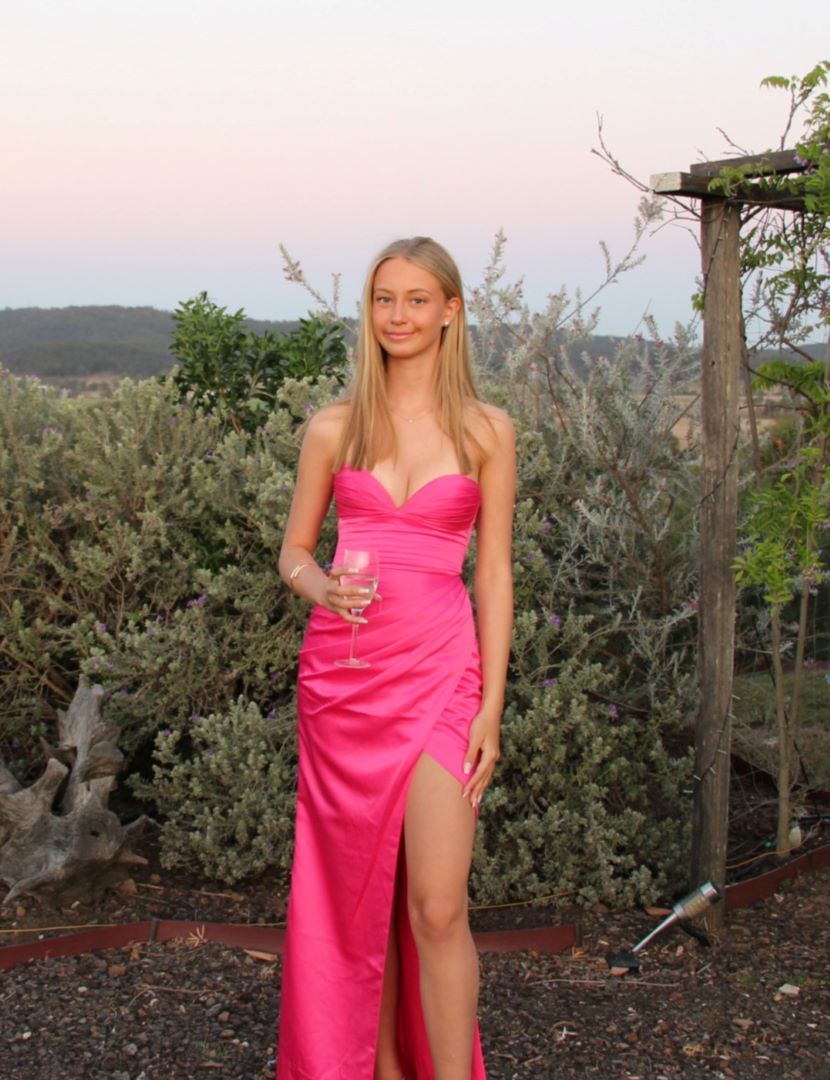 Channel your inner Carrie with THE CITY PLEATED HIGH SPLIT GOWN—a show-stopping, Barbie-inspired pink ensemble. Featuring a plunging sweetheart neckline, pleated bust and waist, and a high-split crossover skirt, this strapless gown exudes glamour. The maxi-length skirt with a slight train, built-in bust cups, and an invisible back zip with a tie-back detail ensure elegance and comfort.